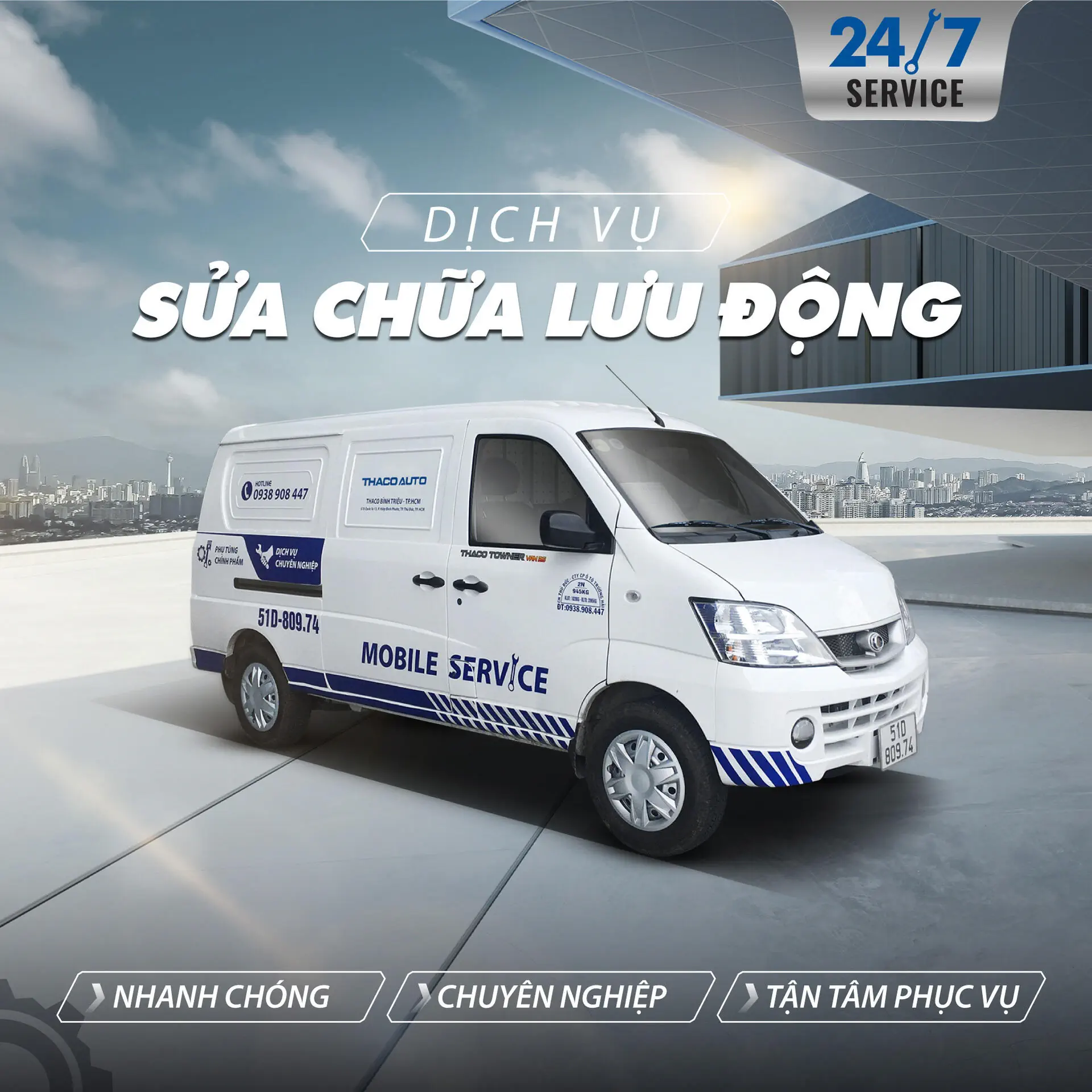 Với tiêu chí “Nhanh chóng - Chuyên nghiệp - Tận tâm phục vụ”, dịch vụ sửa chữa lưu động 24/7 của THACO AUTO Bình Dương hỗ trợ Quý khách hàng mọi lúc mọi nơi với các gói dịch vụ: bảo hành, bảo dưỡng định kỳ, sửa chữa, thay thế phụ tùng chính hãng và tư vấn kỹ thuật 24/7.