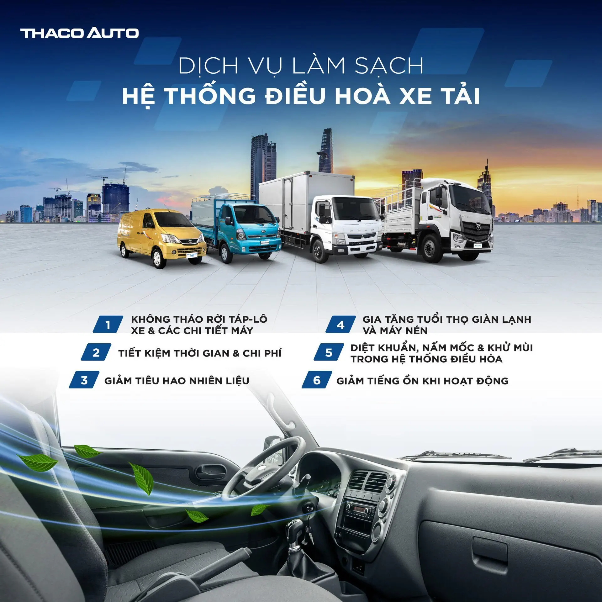 Nhằm gia tăng tuổi thọ hệ thống điều hoà, tiết kiệm chi phí bảo dưỡng xe và mang lại sự yên tâm, thoải mái cho Quý Khách hàng, THACO AUTO Bình Dương cung cấp dịch vụ làm sạch hệ thống điều hòa xe tải bus với các ưu điểm nổi bật: